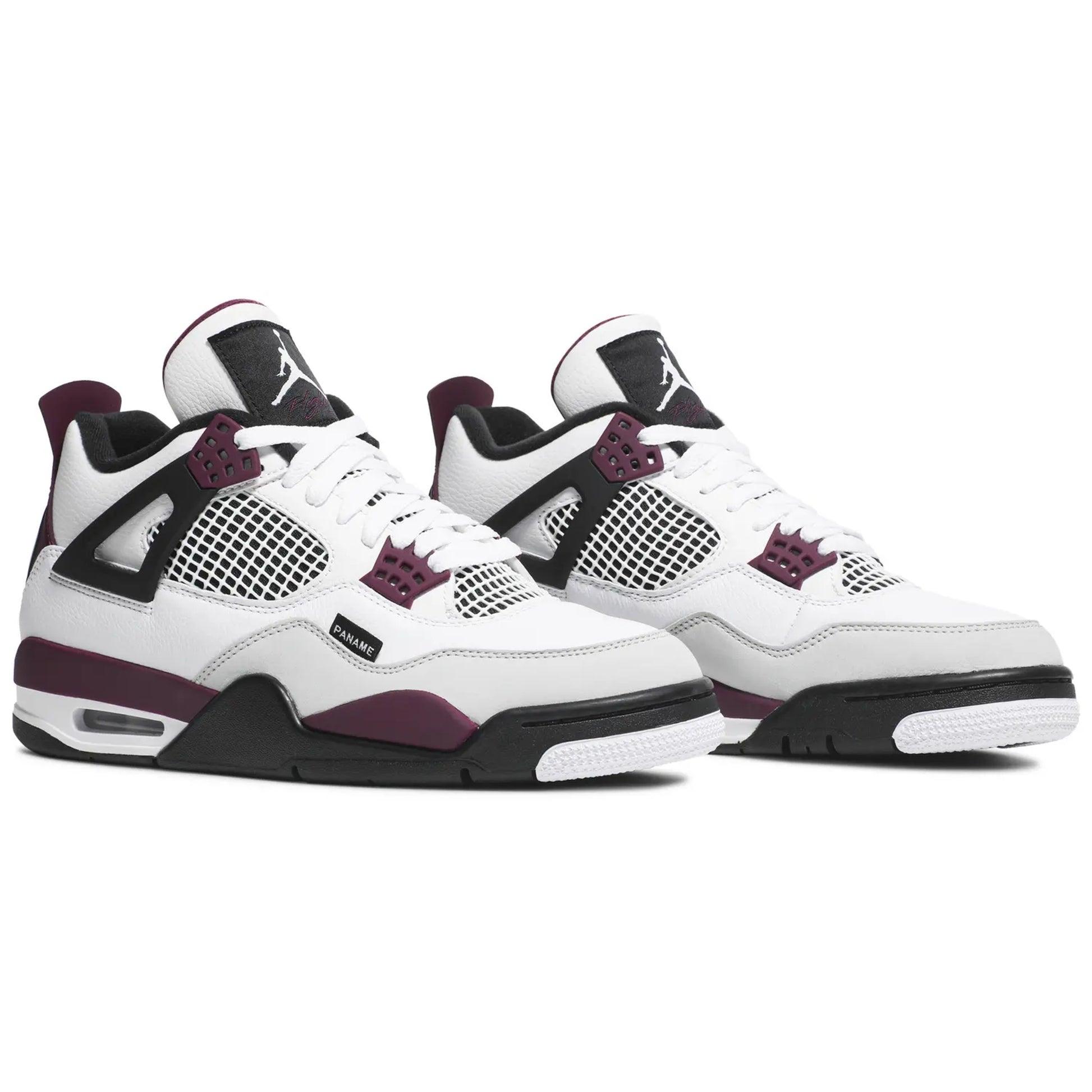 La Jordan 4 PSG présente un agencement de couleurs classique qui rappelle la célèbre Fire Red 4. L’empeigne est en cuir blanc, tandis que des empiècements en nubuck gris recouvrent l’avant du pied. Des touches de bordeaux et de noir habillent les ailes en caoutchouc emblématiques, les œillets et la semelle intermédiaire. Parmi les détails distinctifs, on retrouve l’inscription « PANAME » sur le côté extérieur de l’avant-pied ainsi qu’un badge « PSG » au niveau du talon.